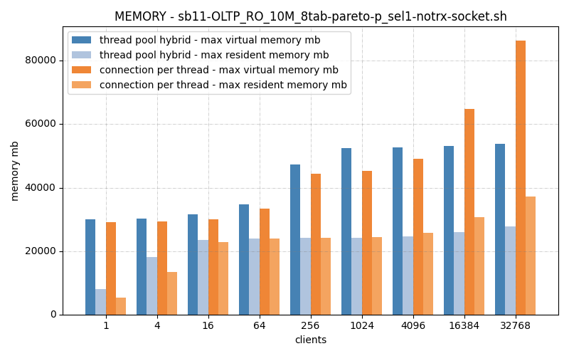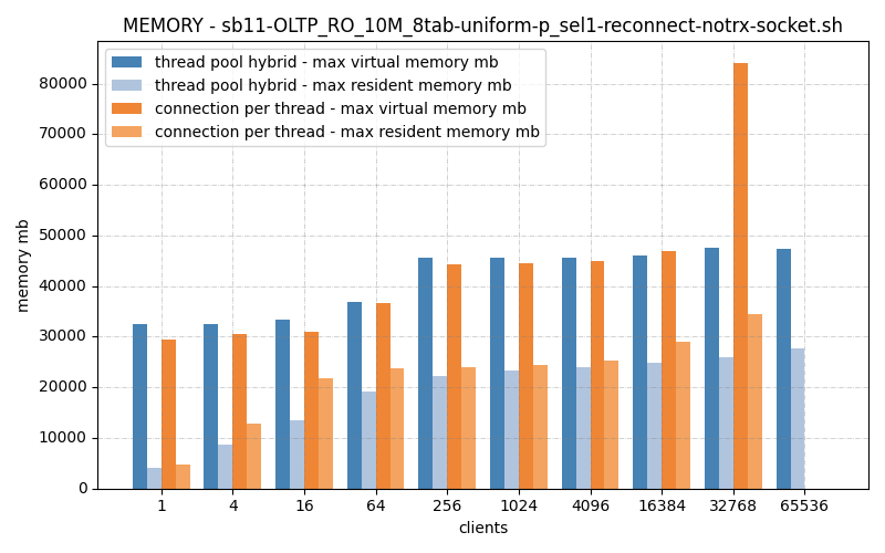 Memory is roughly equal, but connection_per_thread starts to blow up at 32768, which is likely why it dies before it finishes the test, OOM.